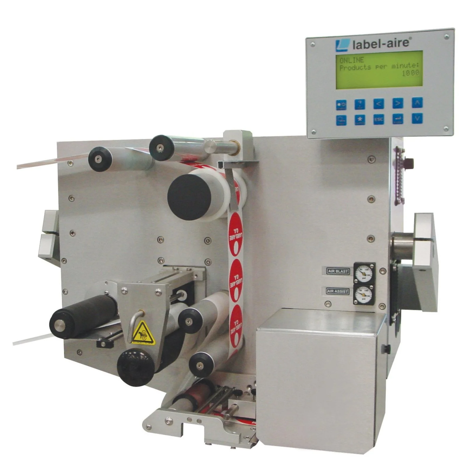 The Label-Aire Model 3114-TS was designed for high-speed tamp-blow labeling applications at a standard dispense speed of up to 1,500″ of web per minute or up to 2,000″ with the optional powered rewind.